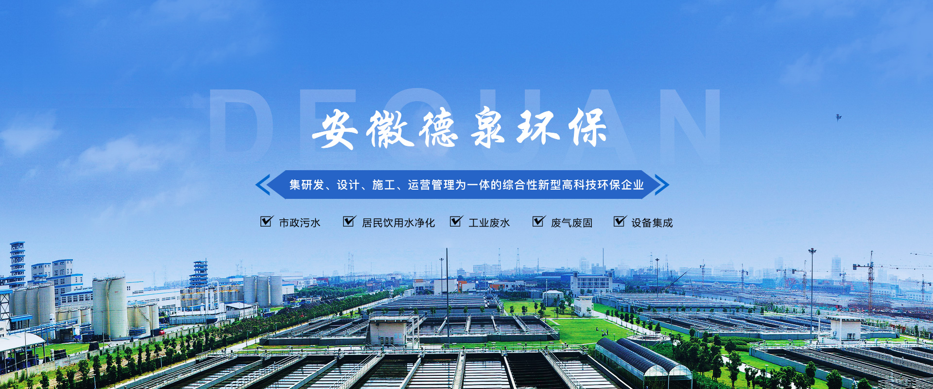 安徽德泉環(huán)保科技有限公司致力于廢水、廢氣、固廢技術(shù)處理研發(fā)、設(shè)計(jì)、施工及運(yùn)營(yíng)管理,從事環(huán)保設(shè)備及設(shè)施的制造和銷售,為環(huán)保項(xiàng)目系統(tǒng)提供專業(yè)的技術(shù)咨詢和服務(wù)。是一家集建筑勞務(wù)分包,工程總承包(EPC)、項(xiàng)目投資(BOT/PPP)、運(yùn)營(yíng)管理(O&M)于一體的綜合性新型高科技企業(yè)。